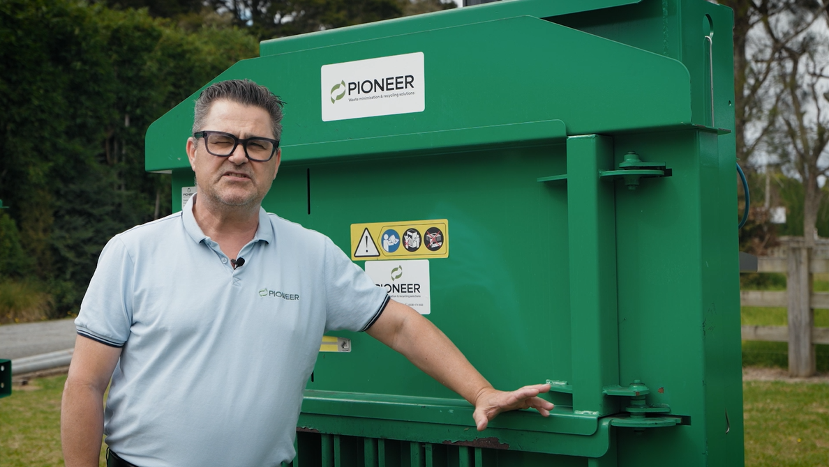 The top door has a large opening for easy loading of material into the bale chamber. Bales can be easily ejected with the hydraulic eject cylinder onto a pallet. This baler has three bale tying points to secure bales once compacted.