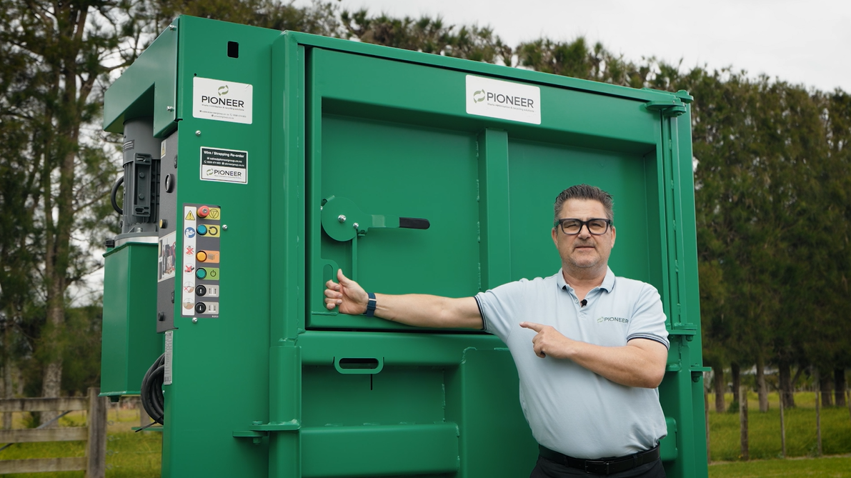 This Baler has as an auto compaction cycle as standard, key locked E-stop with reset button, hour counter to monitor servicing and includes a safe strap bale eject system for easy removal of bales onto a pallet. There are 6 tying points to tie off the bales from this baler.